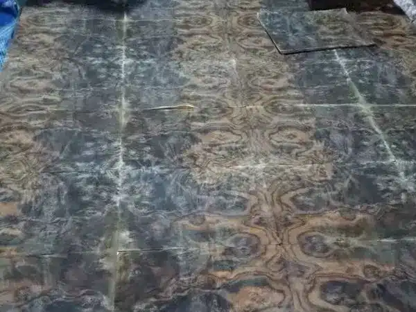 Dark, intricately patterned paper-backed veneer sheets laid out on the floor